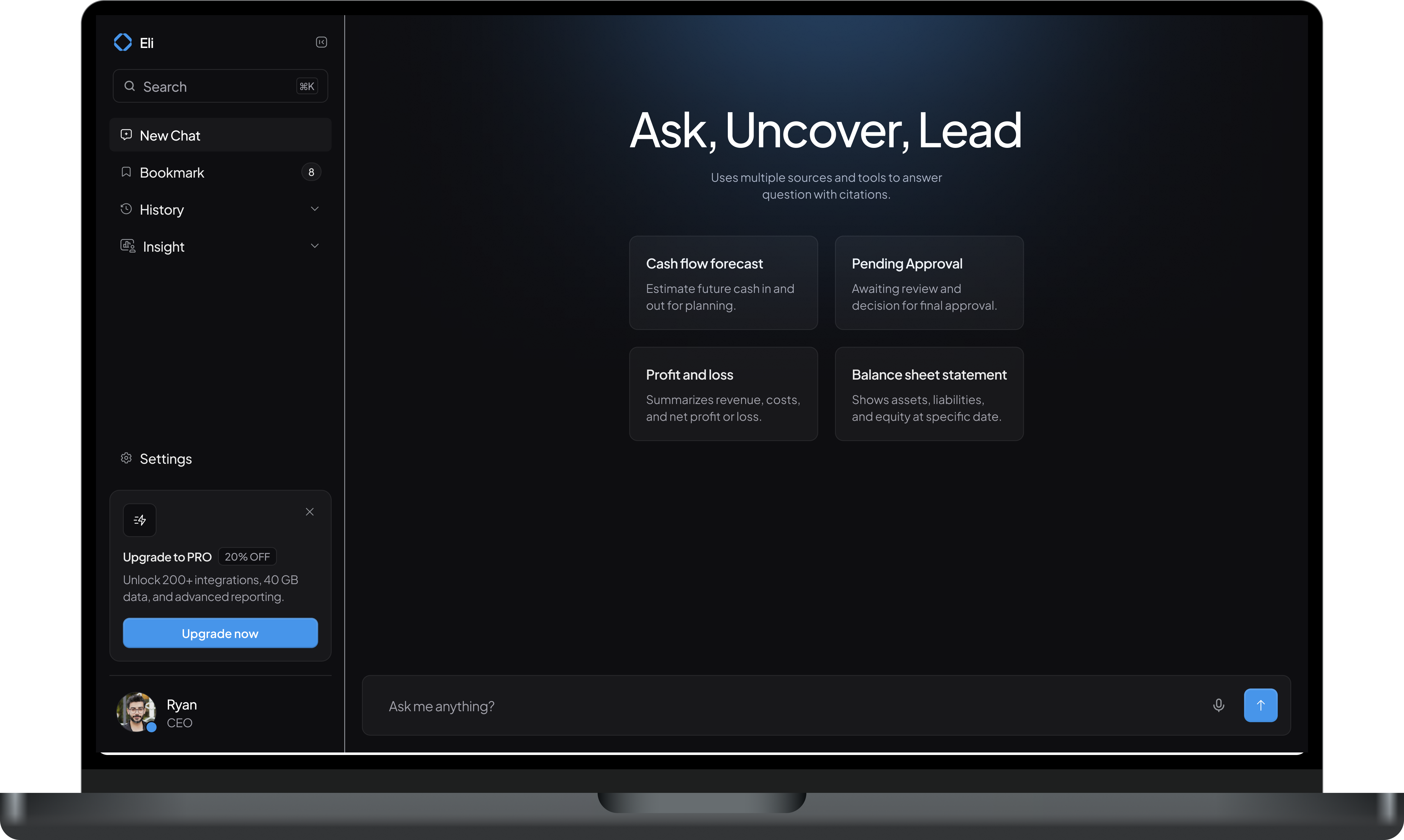 Whether it’s your ERP, CRM, project management tool, or finance software — ELI connects and works seamlessly across all platforms, giving you a single intelligent interface.